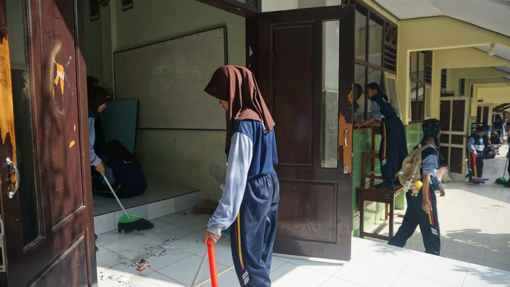 Kegiatan dimulai sejak pagi hari. Setiap kelas dibagi menjadi 3 tim, yakni tim kebersihan luar, tim kebersihan dalam, dan tim mading. Untuk tim kebersihan luar, kelas 7 mendapatkan area dari halaman depan hingga gapura Jalan Adiwacana. Kelas 8 mendapat area lapangan basket hingga depan KOPSIS, sementara kelas 9 mendapat area mulai dari greenhouse hingga lapangan belakang. Untuk tim kebersihan dalam, jobdesc mereka adalah membersihkan kelas masing-masing. Untuk tim mading sendiri, sesuai namanya mereka mendapatkan tugas untuk membuat mading adiwiyata di kelas mereka masing-masing.