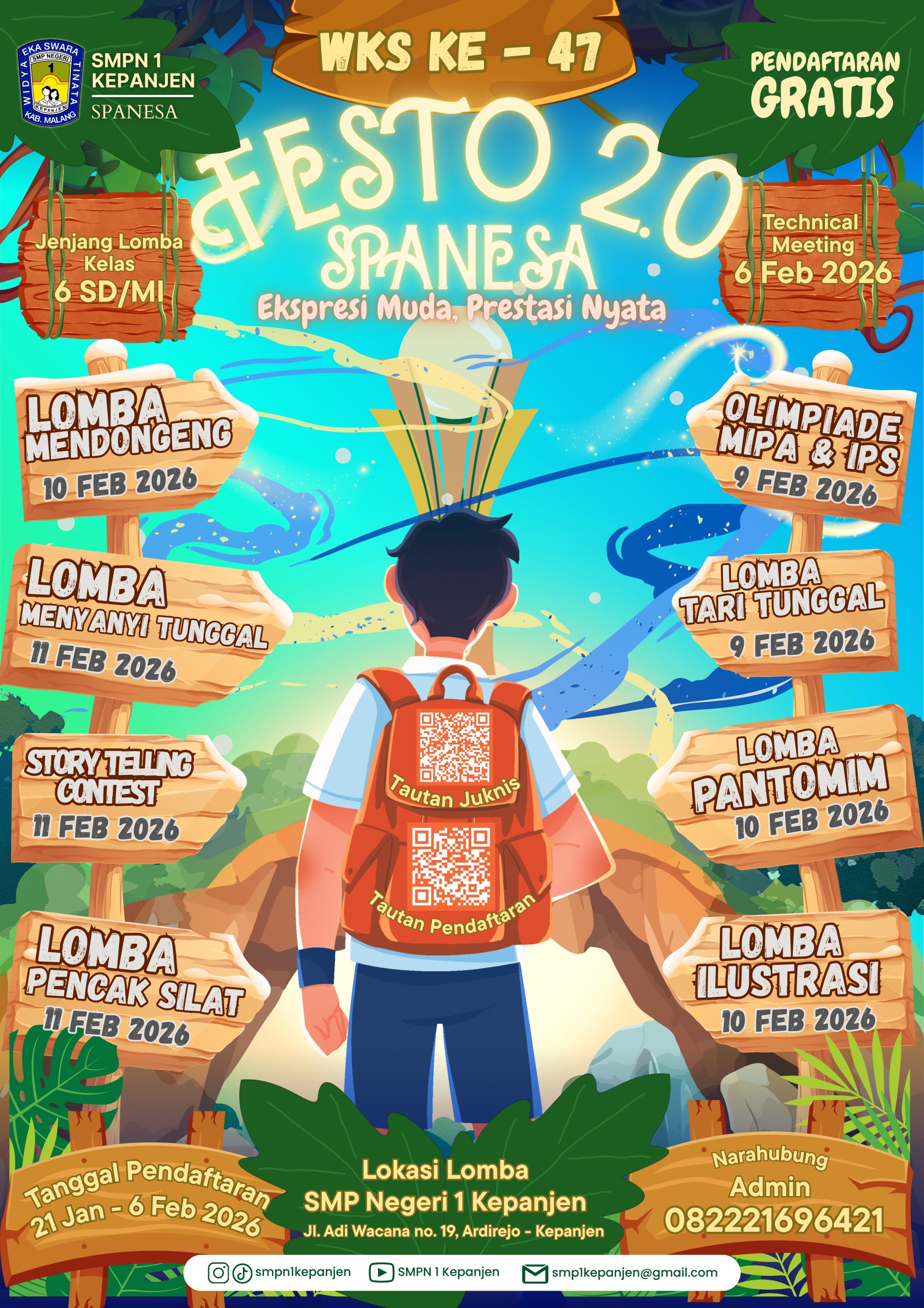 Dalam rangka memperingati HUT ke-47 SMP Negeri 1 Kepanjen (SPANESA), kami menyelenggarakan “FESTO 2.0 SPANESA” (Festival Seni dan Olimpiade SMP Negeri 1 Kepanjen) yang dapat diikuti murid kelas 6 SD/MI se – Malang Raya, diantaranya: